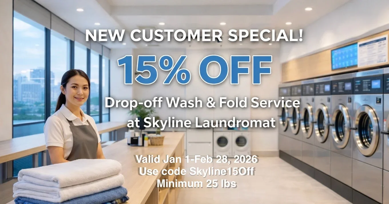 January 1-February 28, 2026: 15% off drop off laundry services for new customers.